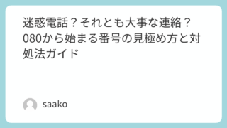 生活 迷惑電話?それとも大事な連絡?080から始まる番号の見極め方と対処法ガイド 知らない電話番号からの着信、特に「080」で始まる番号ってちょっと不安になりませんか?最近では迷惑電話や詐欺被害の話もよく耳にするので、「もしかして危ない電話かも…」とつい警戒してしまう気持ち、よくわかります。でも実は、080番号はごく一般... 生活